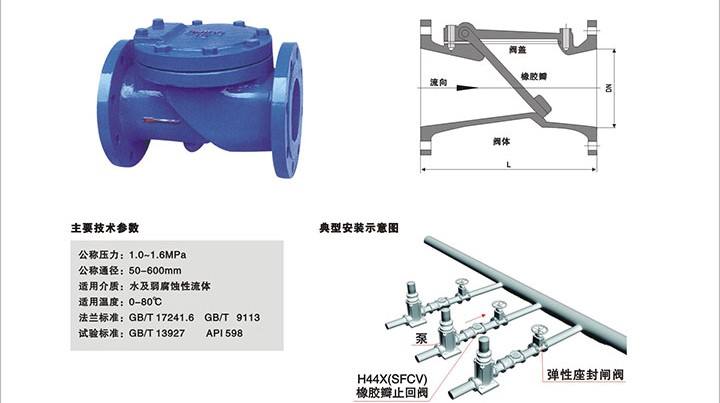 橡膠瓣止回閥主要由閥體、閥蓋及橡膠瓣三種主要零件組成。其中橡膠瓣由鋼板、鋼棒及強化尼龍布做襯底.外層披翟橡膠制成閥瓣開關壽命可達l00萬次。該閥采用全流面積式設計,具有水頭損先小,不易堆積雜物維修簡便等特性。該閥主要適用于給排水系統可安裝于水泵出水口處以防止倒流及水錘對泵損害。該閥還可安裝在蓄水池進出水管的旁通管上以防止池水倒流至給水系統中。
